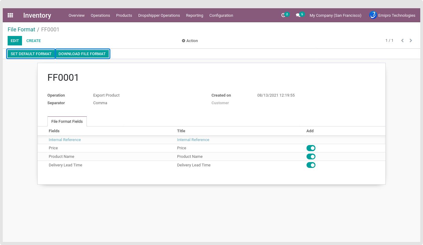 In this feature, we can ‘SET DEFAULT FORMAT’of the file for a particular operation. When we click on this button then it will list the optional and required file format fields inside the “File Format Fields’‘ tab. also we can ‘DOWNLOAD FILE FORMAT’ by clicking on this button which is available on the top of the form beside the ‘SET DEFAULT FORMAT’button. In the list of the fields beside have an option for ‘Add’. whenthe ‘Add’ option is enabled for a particular field that means that field is necessary for that operation and when to disable that option that means that field is unnecessary for the particular operation.