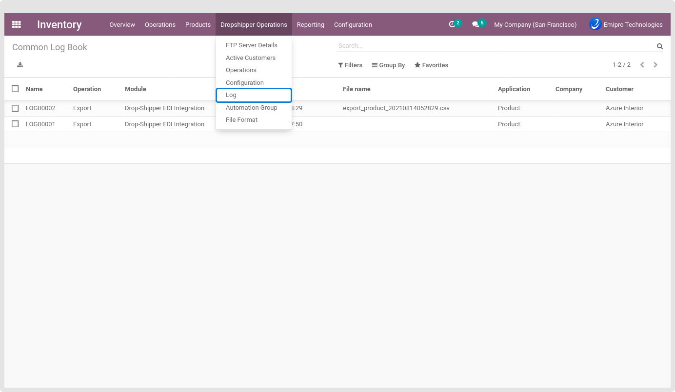 The log shows entire operations that were unsuccessful and successful so that you can identify the status of the operation which you have performed and also after completing the process the performed operation file is attached in the log. You can check Logs by navigating to Inventory -> Dropshipper Operations-> Log.