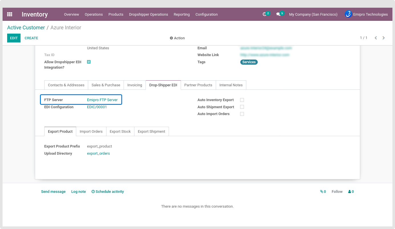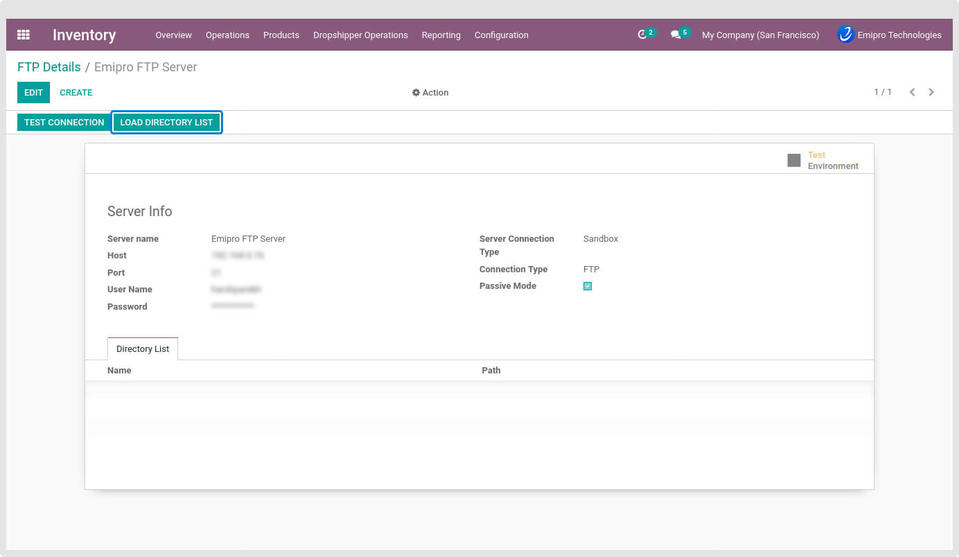 Once you have installed Dropshipper EDI Integration from Apps -> Dropshipper EDI Integration in Odoo then you can see the ‘Drop Shipper Operations’ menu inside the Inventory App. For configure the FTP Server Details Go to the Inventory ==> Drop Shipper Operations ==> FTP Server Details menu.