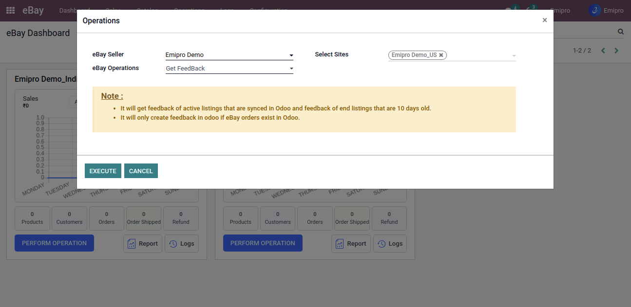 Navigate to eBay / Processes / eBay Operations / Get Feedback to get the feedback from eBay to Odoo.