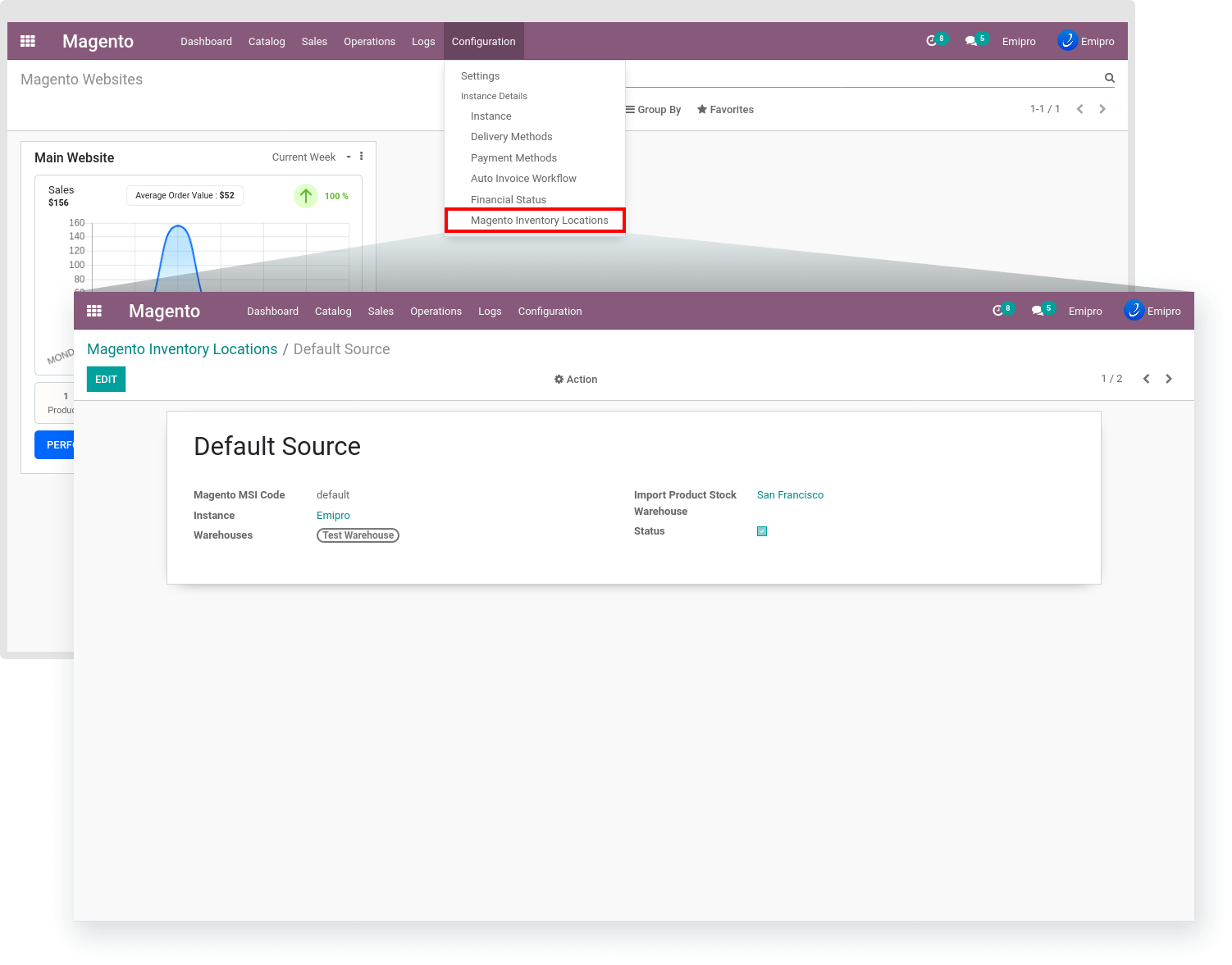 As per the above configuration, The product’s stock from the “San Francisco” warehouse will be set in the Magento’s Emipro Inventory Source and product’s stock from the “Test Warehouse” will be set in Magento’s Default location.