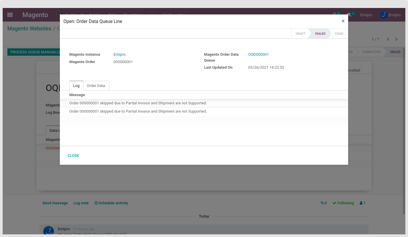 In some cases, Still not configure the Financial Status yet and you were trying to import the order then your order goes to Fail state. Also, find the log as shown in the below screenshot.