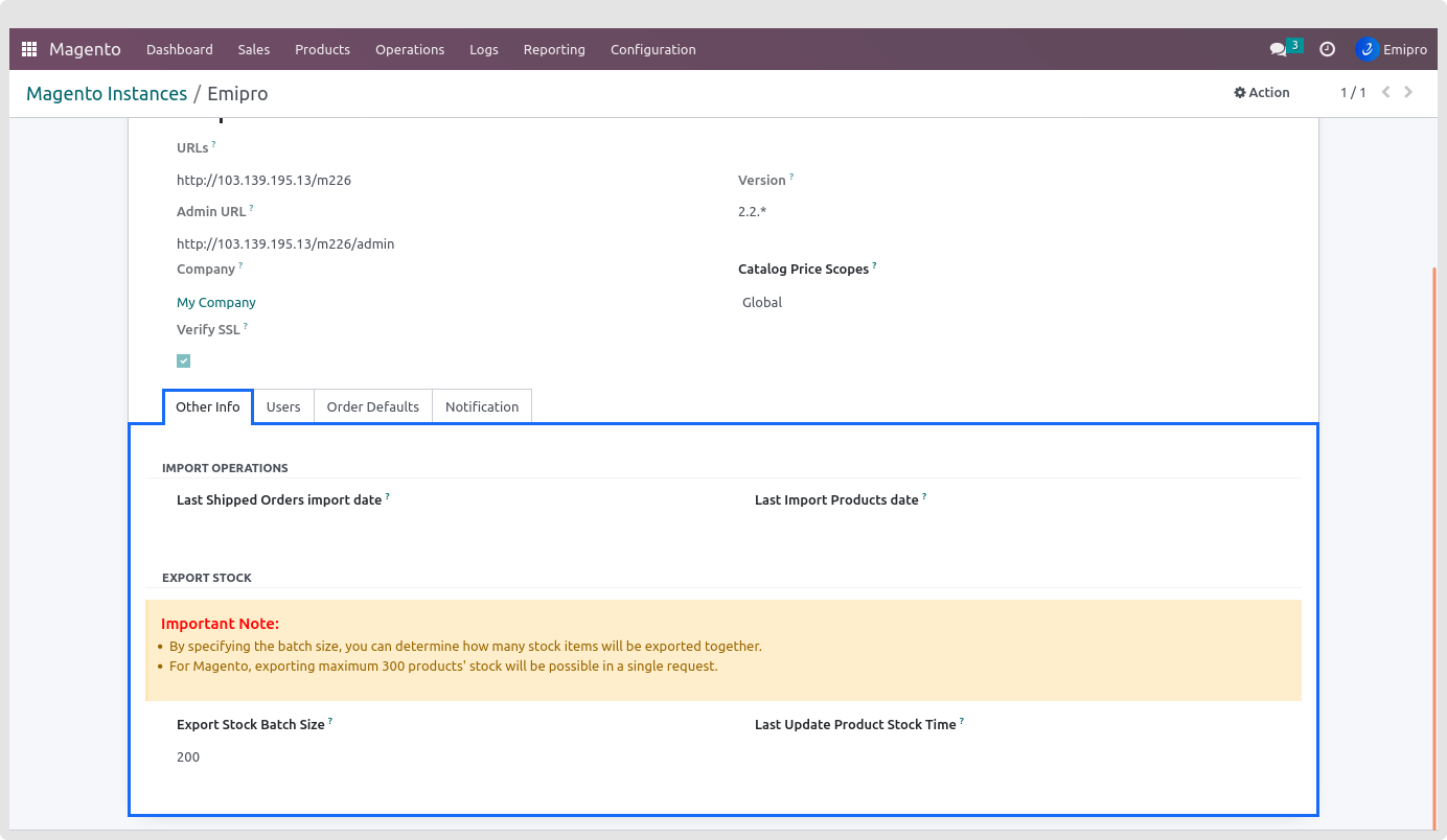 You can see the last imported order, product as well as export product stock date from the Other Info Tab in the same window. This will give you an idea of the last actions performed.