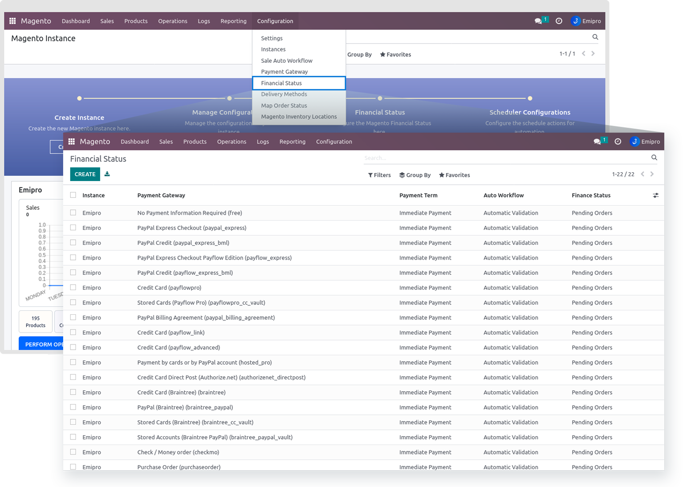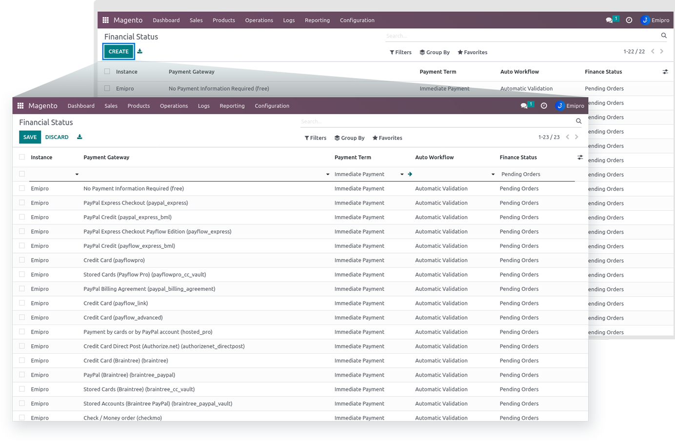 You can create new financial status by clicking on the Create button. Set the Instance, Payment Gateway, Payment Term, Auto Workflow, and Magento 2 Financial Status.