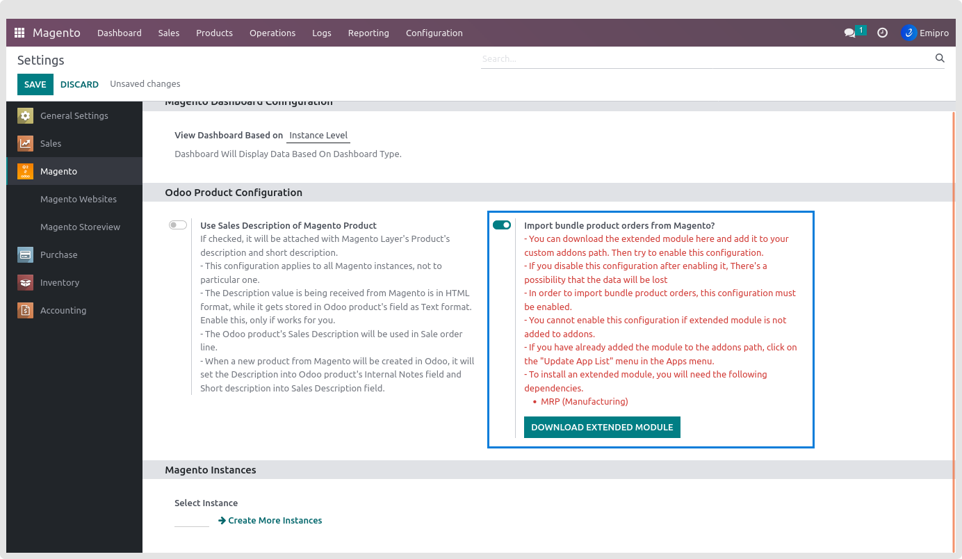 Now, our connector allows us to import bundle product’s orders from Magento. For that, we need to enable 1 configuration and install MRP (Manufacturing) and our extended module.