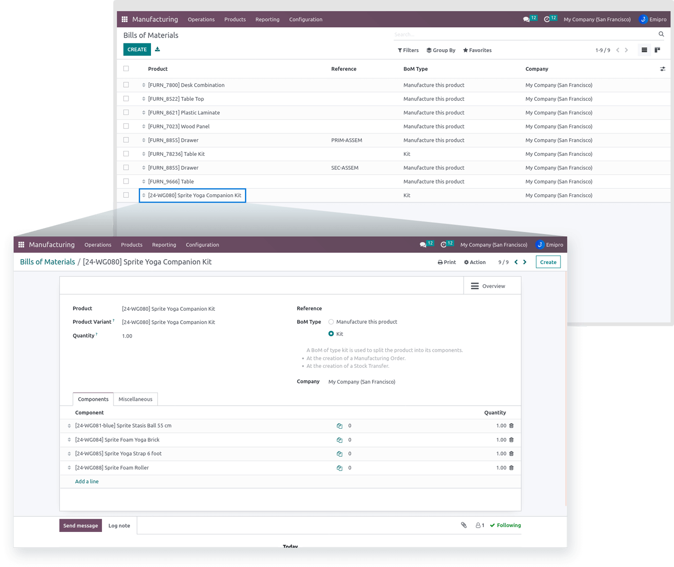 You can check the created bundle product components by navigating to Manufacturing > Products > Bills of Materials.