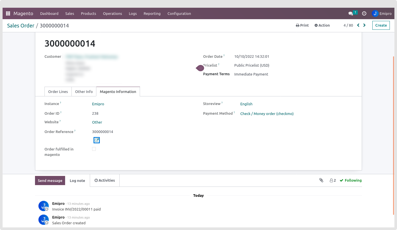 The link for Magento sale order is available in the ‘Magento information’ tab of sale orders near ‘Magento order reference’ in the Magento layer of Odoo. Clicking on the link will redirect to the order in Magento store provided the admin panel of the store is logged in the same browser. If not, it will redirect to the Magento store login page.