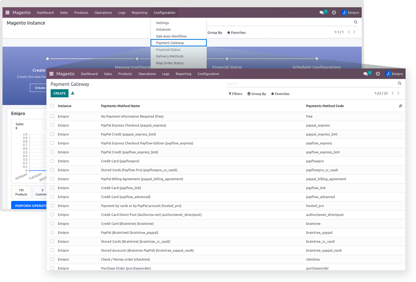 When the Instance is created, it will automatically fetch all the payment methods from Magento to Odoo. However, you can manually configure the Payment Methods if you want to add a custom payment method. To add a payment method, you will need to navigate to Magento -> Configuration -> Payment Gateway.