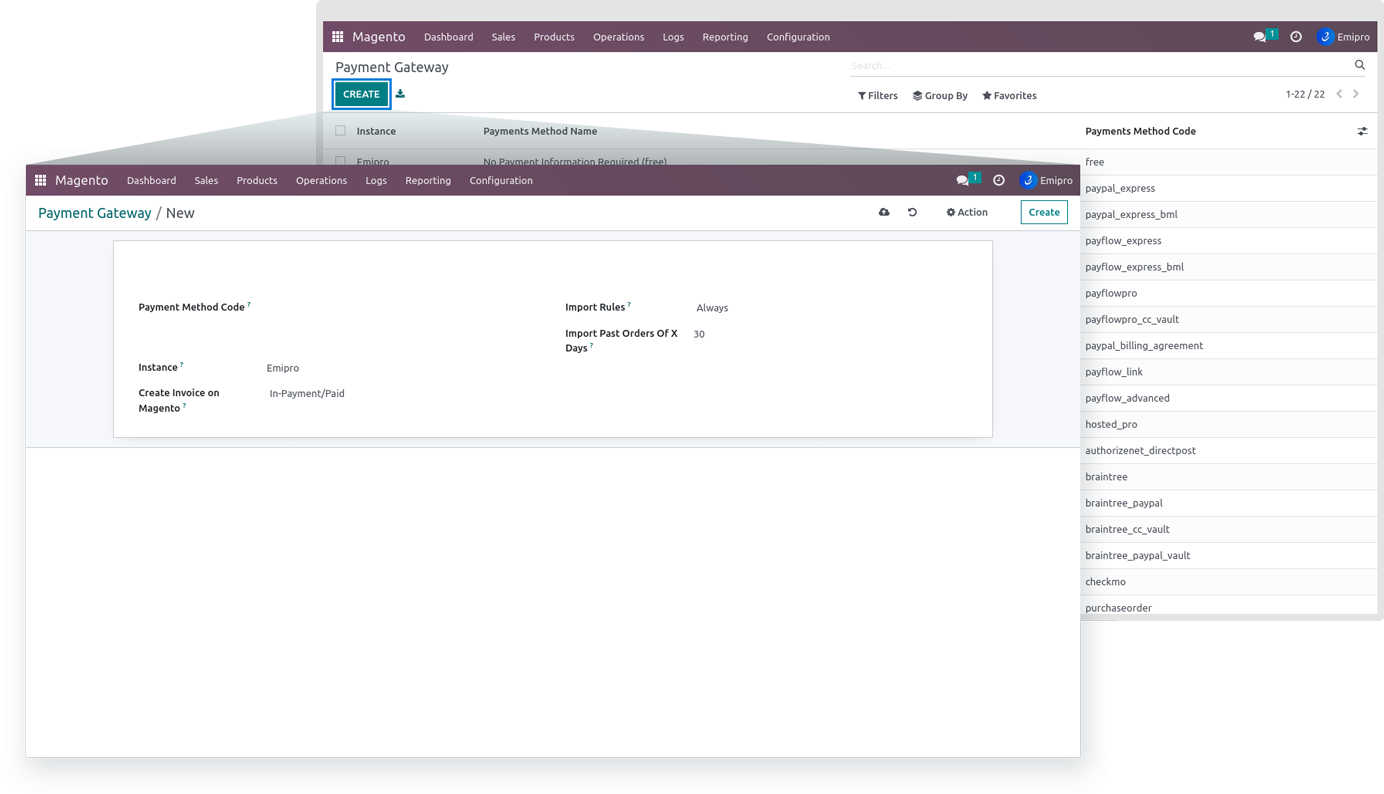 To add new Payment Methods, click on the Create button. Add Payment method name, Magento Payment Method code (which is defined in magento), and select the Instance for which you want to use that Payment Method.