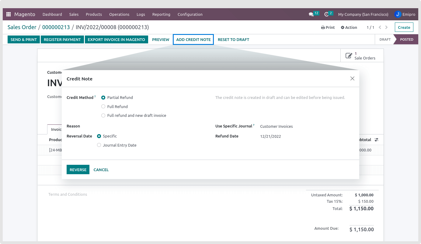 - Full refund and new draft invoice: The credit note is auto-validated and reconciled with the invoice. The original invoice is duplicated as a new draft.