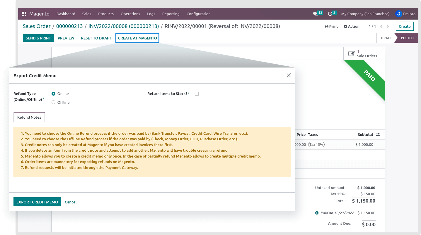 After that click on the Create At Magento button. Select the Refund type option online / offline and then click on Export Credit Memo button.