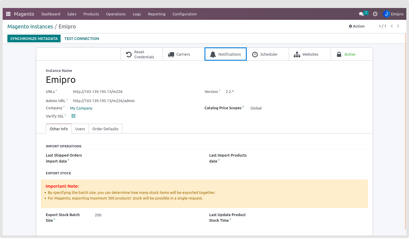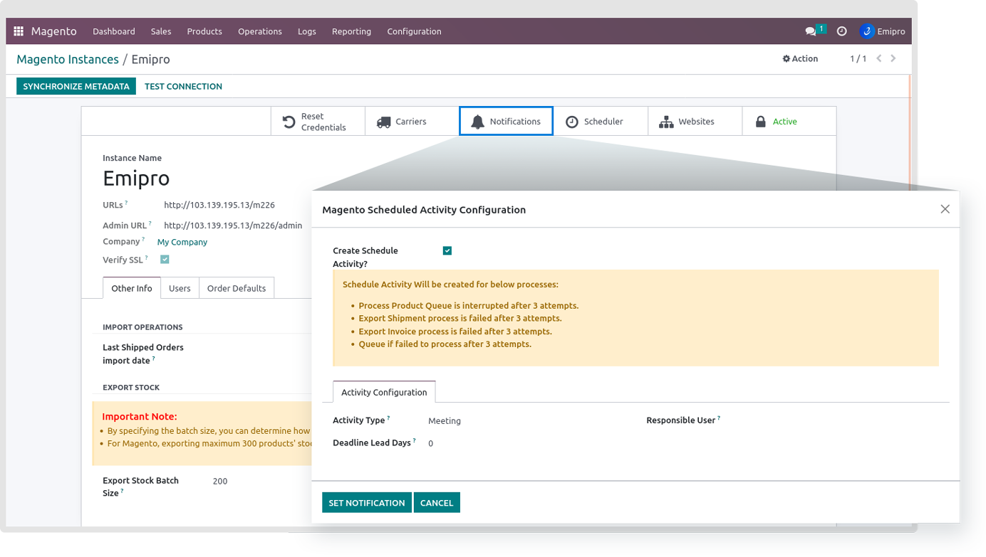 After clicking on Set Notification button, New tab “Notifications” will be visible in the instance page and now onwards schedule activity will be generated after failed queue or max attempts of queues, invoice or shipment.