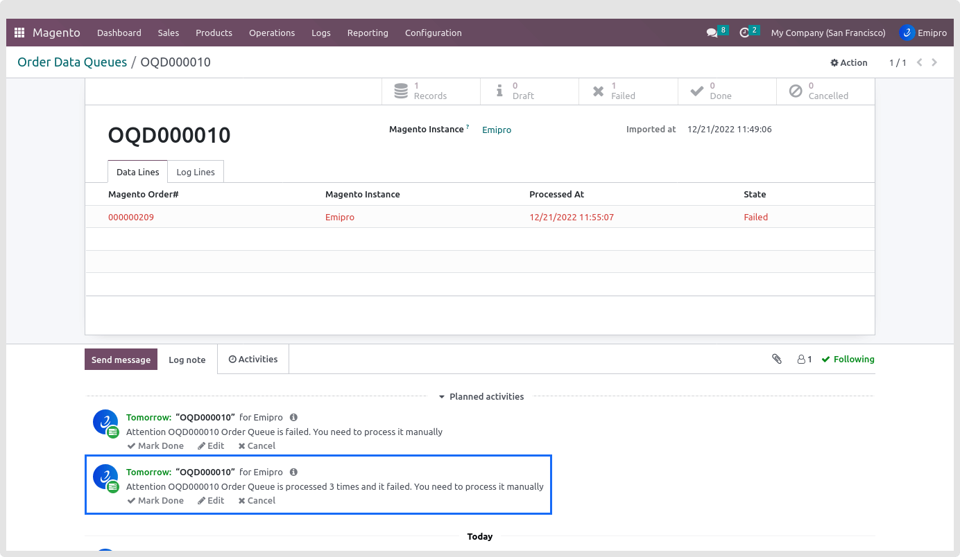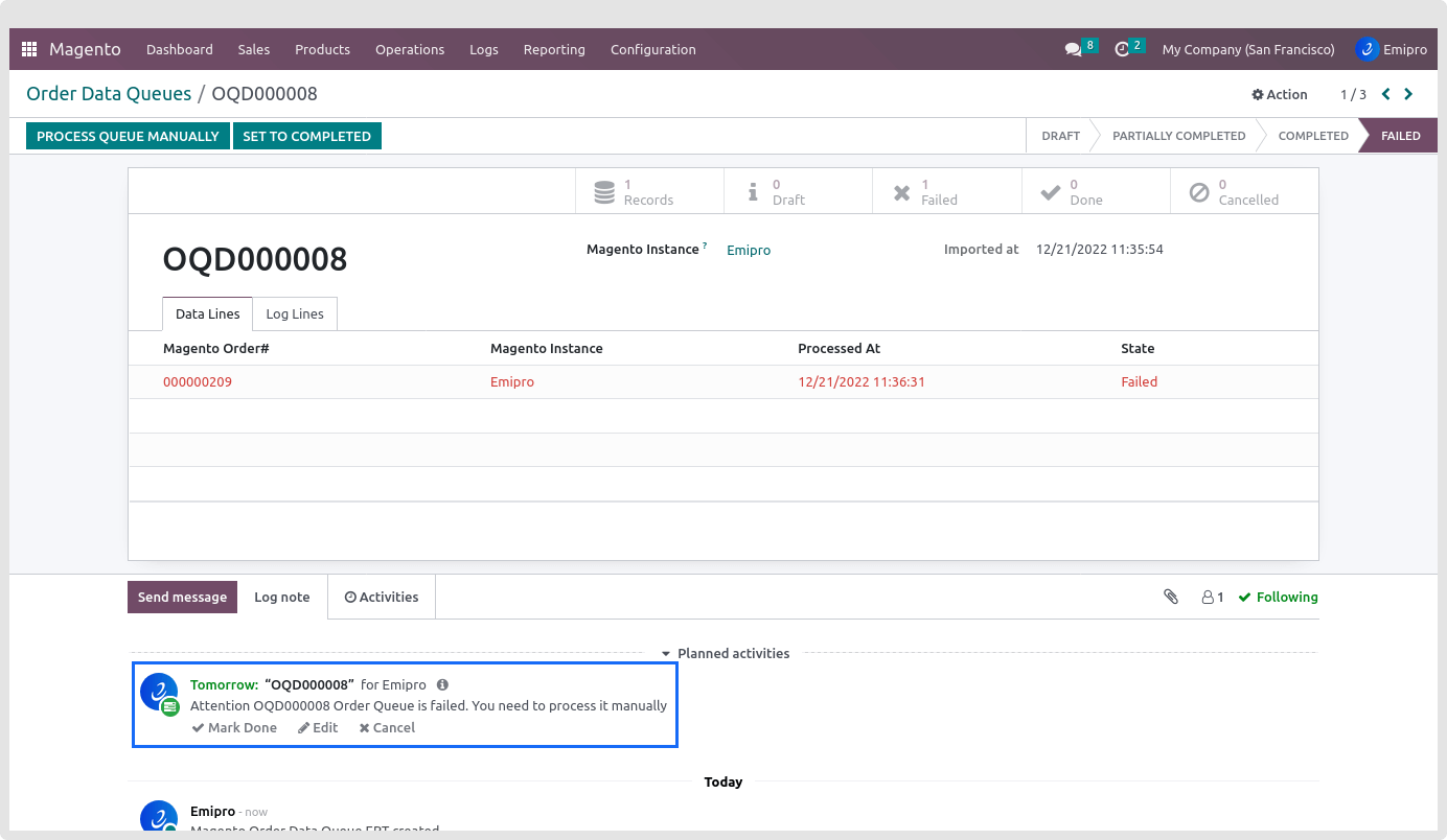 If any order, product or customer queue fails then schedule activity will be created for this operation.
