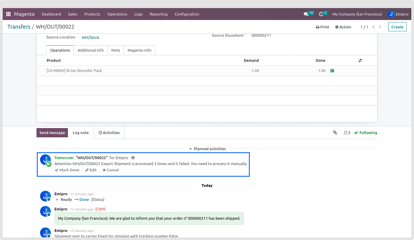 When shipment is not exported after 3 attempts then scheduled activity will be created.
