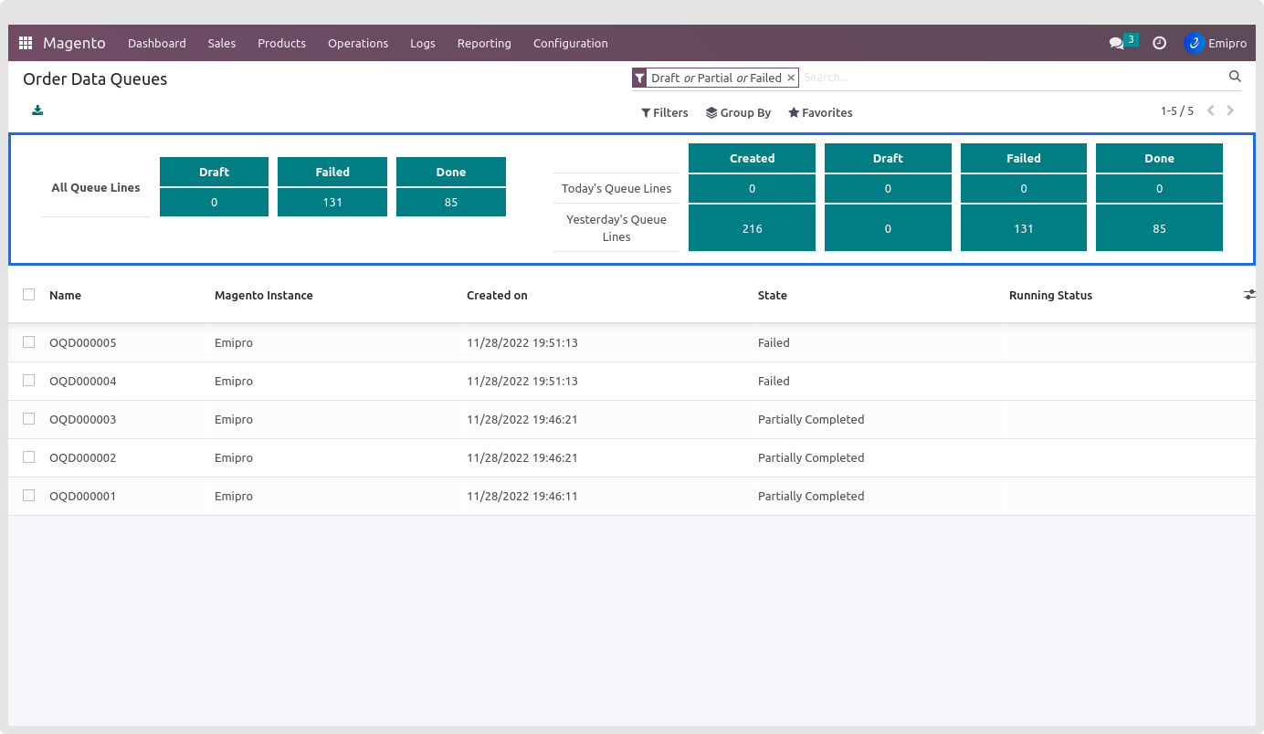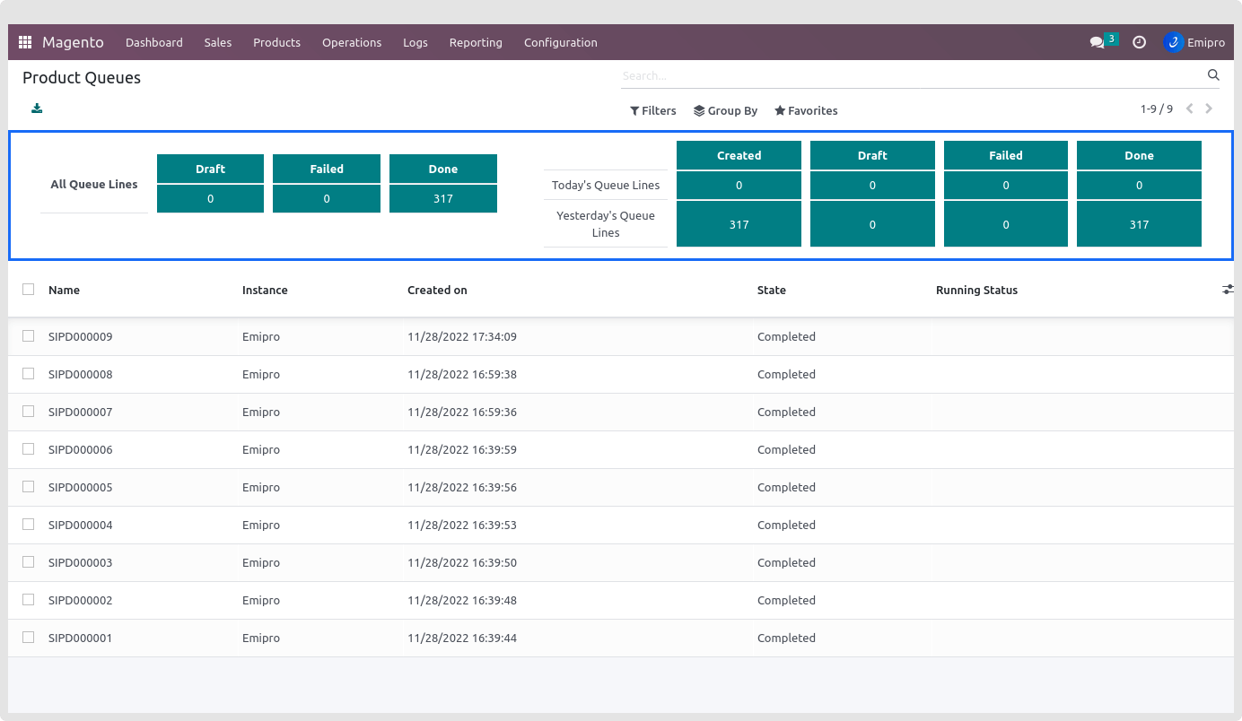 To see the order queue line dashboard, navigate to Magento > Logs > Products Queue.