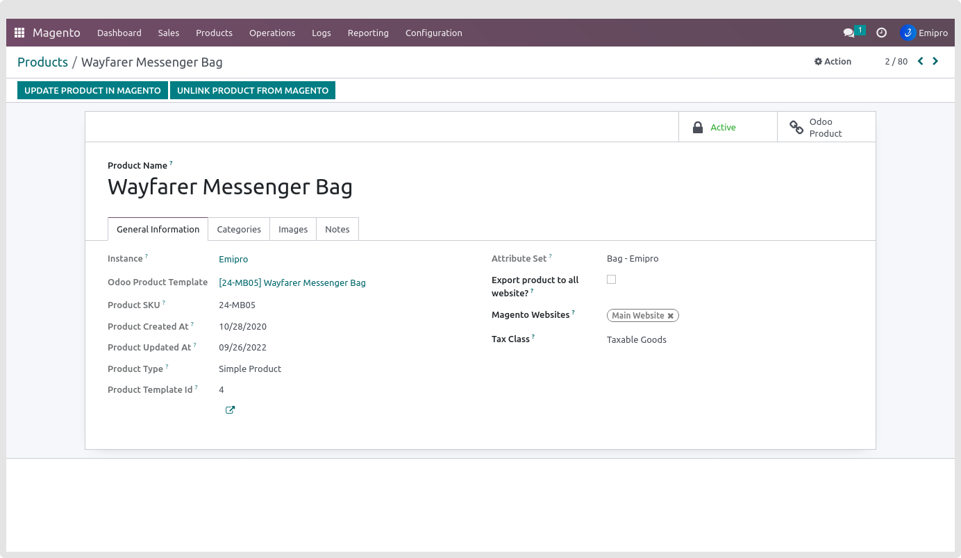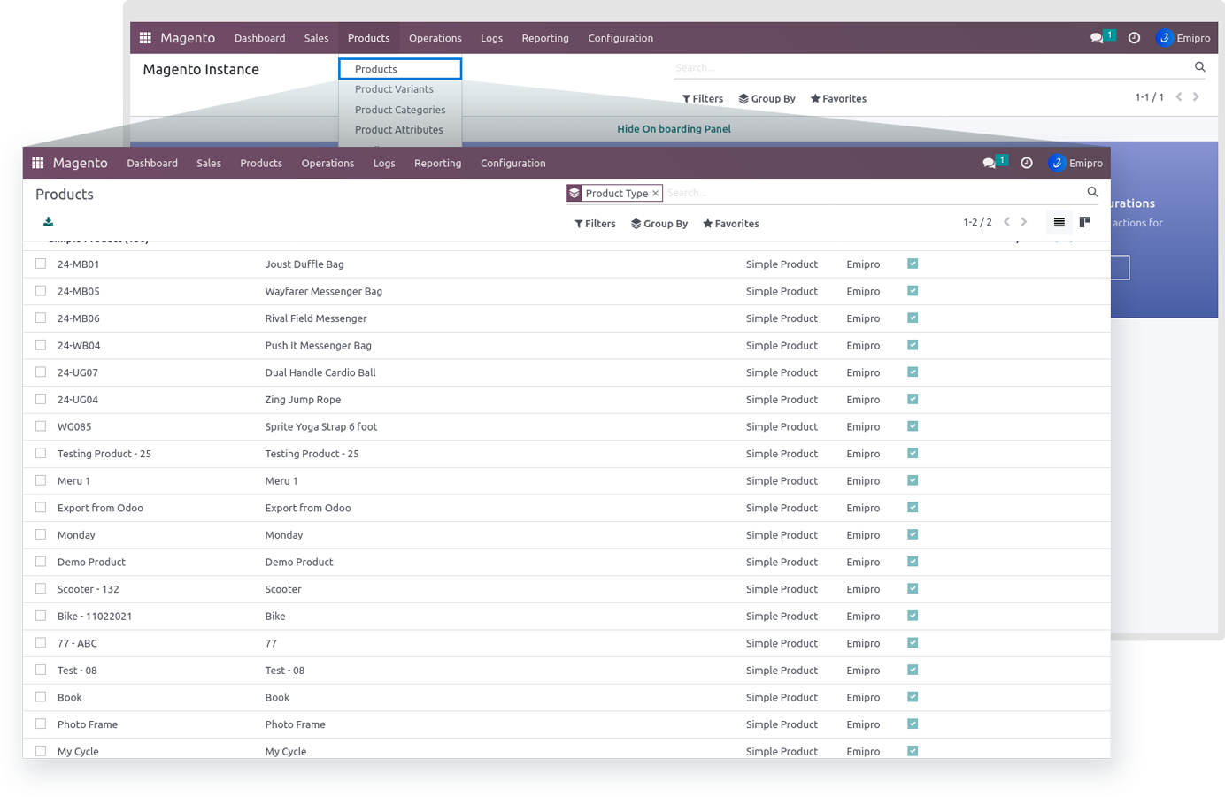 While importing the simple product and after the process, that queue has a simple product type in the queue line. The new product will be created in the Magento > Products > Products as the simple product template and Magento > Products > Product Variants as the Simple product. Here also all the simple product data is saved in the Product template and Product layer.