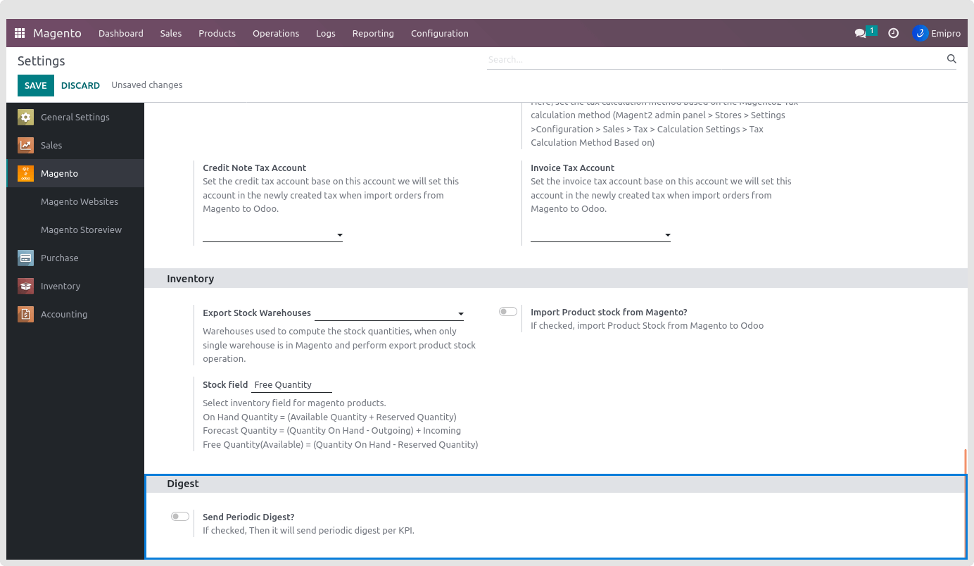 To configure digest emails, follow the path : Configuration > Settings > Select instance > Magento Digest > Enable send periodic digest.