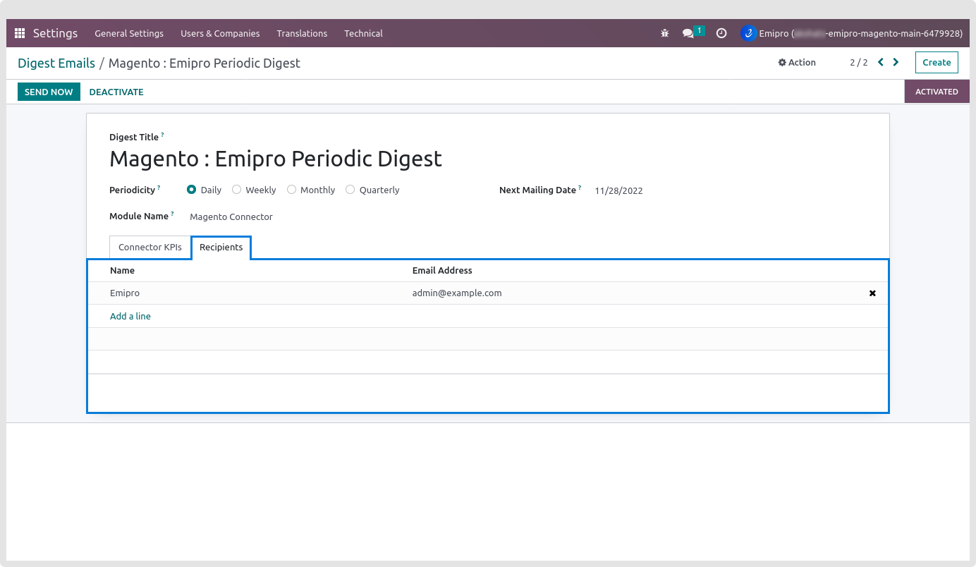 By default, the Connector Digest Email record is Deactivated when you enable your instance digest Email, which includes all KPI measurements across your Odoo database and is sent daily to administrators.