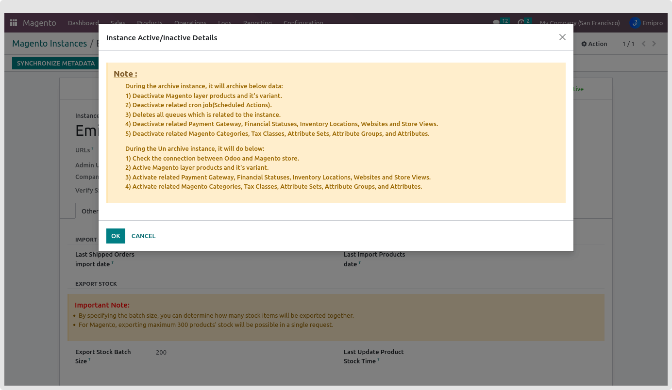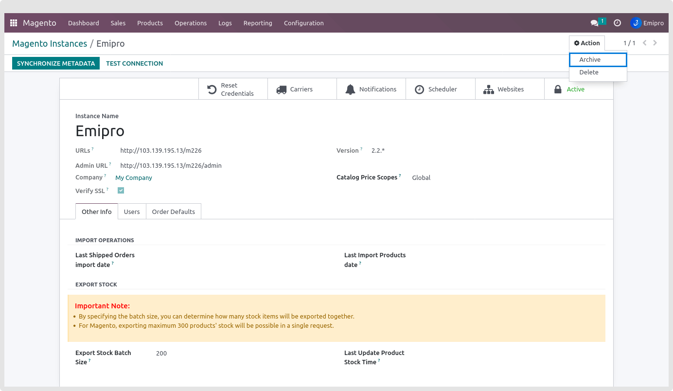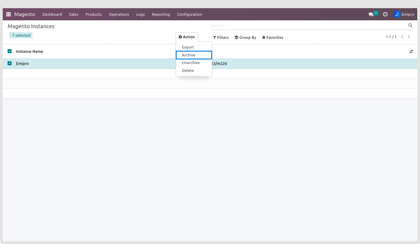 - Archive the Instance from the Form view of the Magento Instance. Select the Instance and open its form view. Click on the Action and Archive the Instance from there.