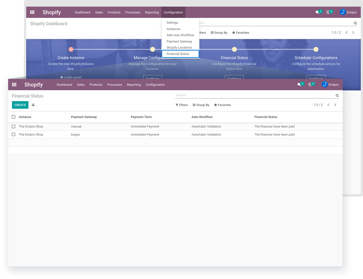For configuring financial status, go to Shopify / Configuration / Financial Status and click on the Create button. Select Instance, Auto Workflow, Payment Gateway, Payment Term, and Financial Status that are relevant to you. Once this is configured, it will be available under Shopify / Configuration / Financial Status.