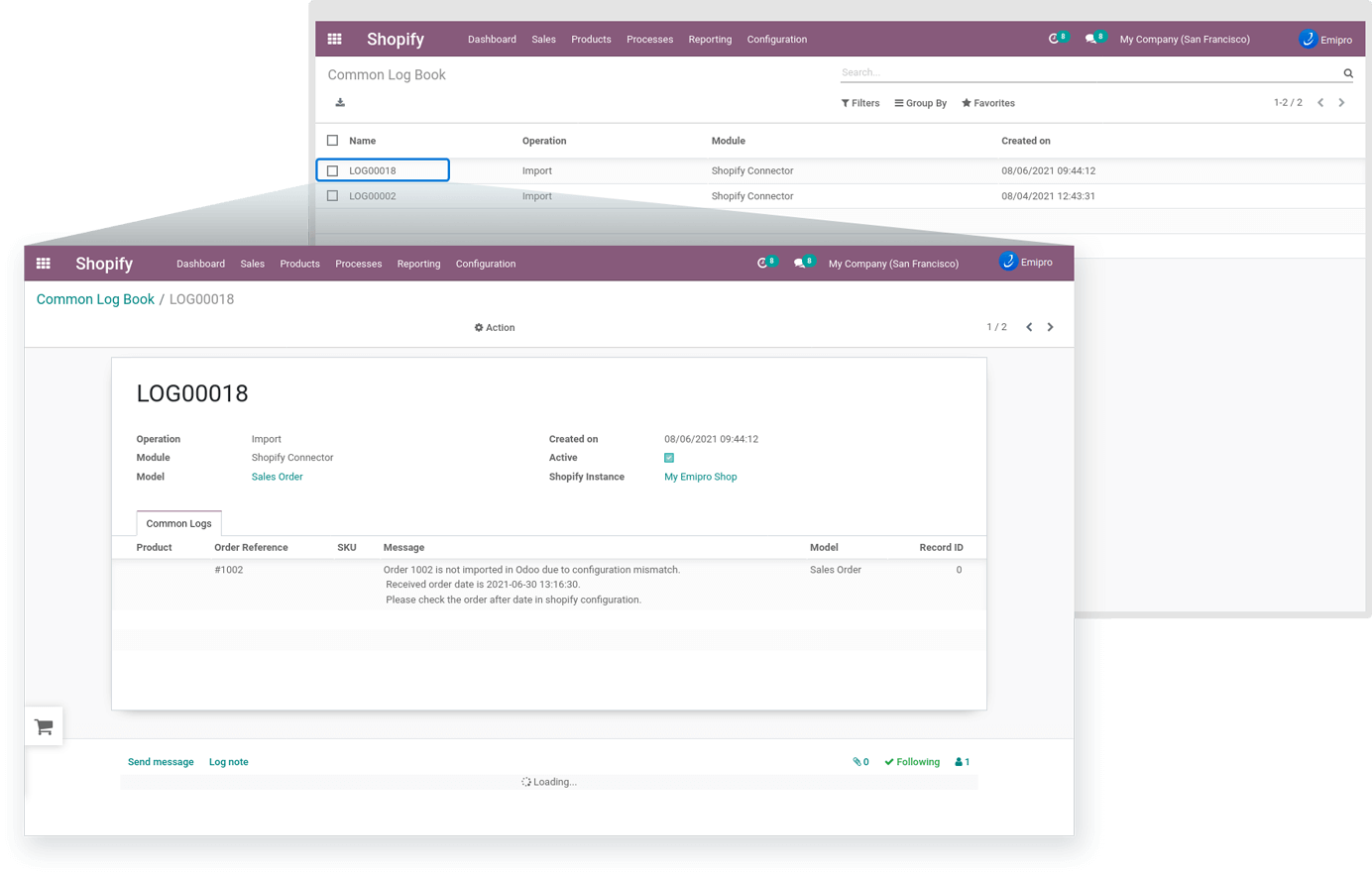Mismatch Log shows an entire log of operations that were unsuccessful so that you can identify its reason. You can check it in Shopify / Processes / Log Lines. However, you can also access the complete Log Book from the same menu above. Some of its examples are,