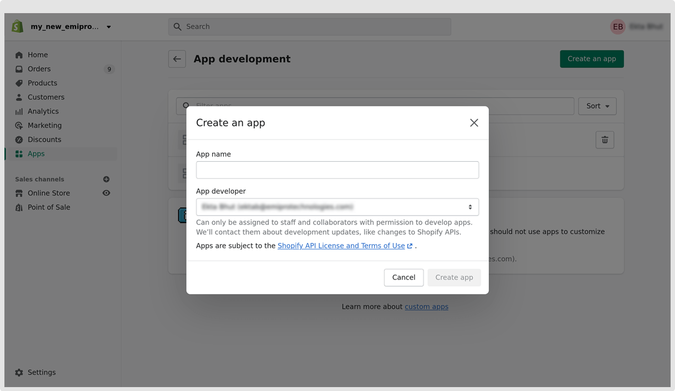 Open your Shopify account and click on the Apps button on the left side menu. Navigate to the bottom section and you will find the button Develop apps for your store. Click on it and you can see the list of all configured development apps. On the top right, click on the button Create an app and fill up all the required information.