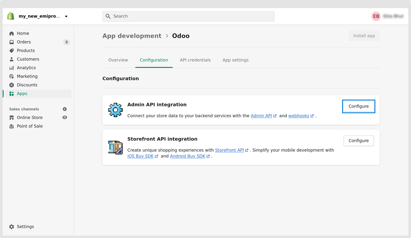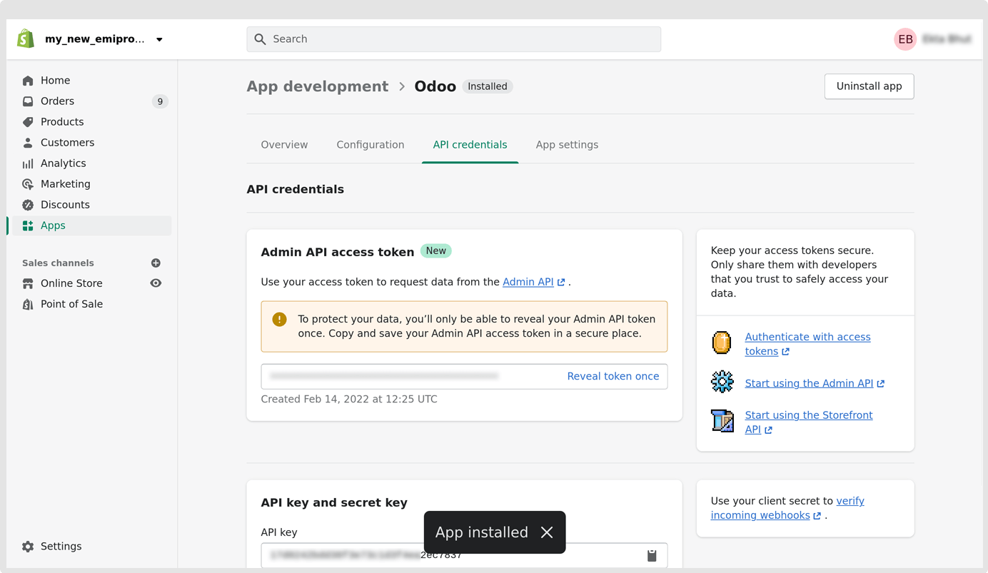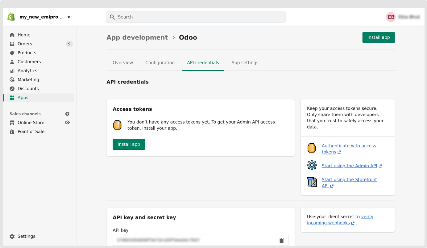 Now, Navigate to the third page, API credentials, Here you need to generate an Access Token. For that you need to install the app by clicking on button Install App.