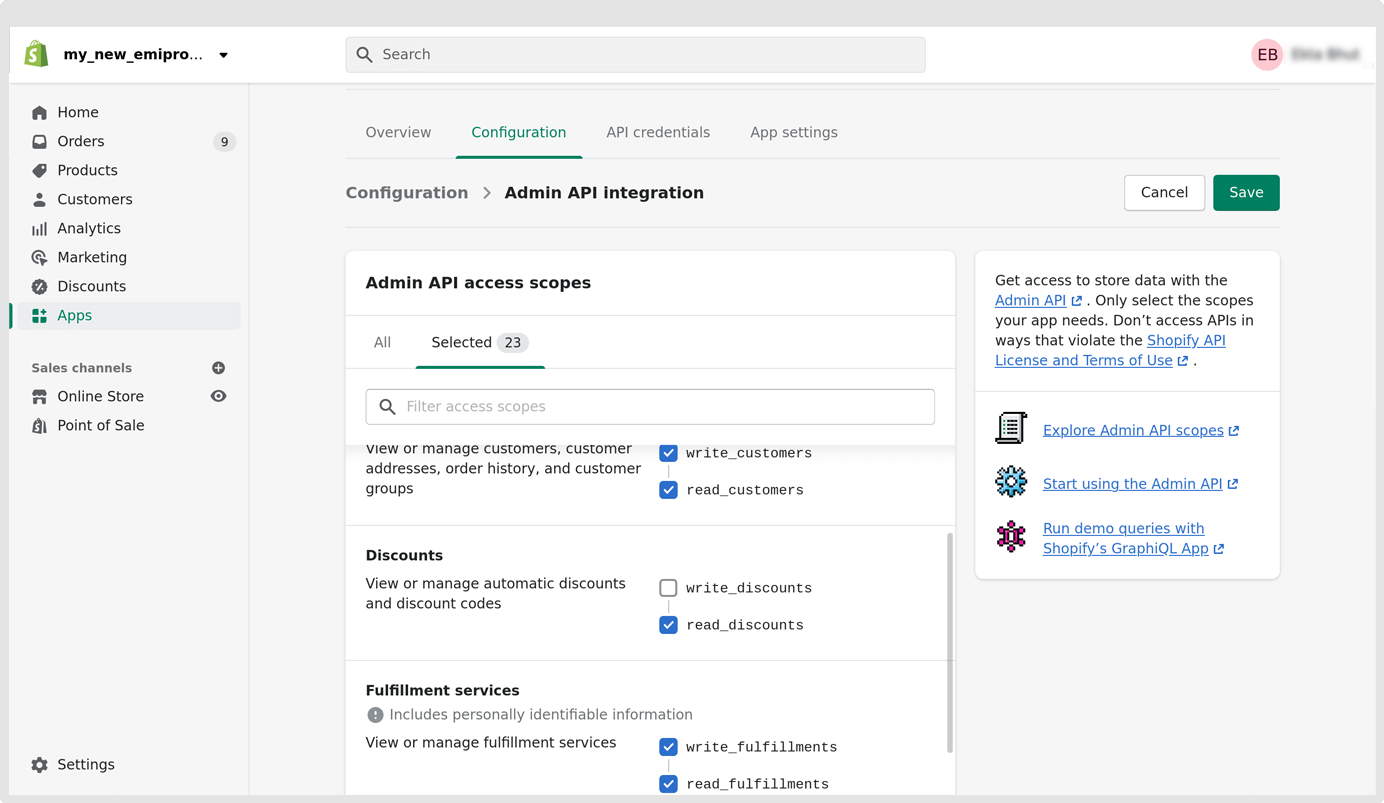 Moving further to the section Admin API, set the permission for each parameter carefully in order to have the seamless synchronization between Shopify and Odoo. The parameter with only Read Access will restrict the data access from Odoo and thus cannot be updated at Shopify end. Therefore, it is advised to grant appropriate permissions to certain parameters.