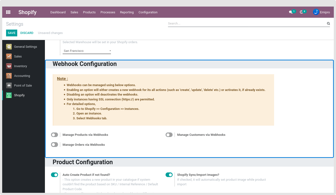 After selecting the Shopify Instance, all its configurations will be visible on the same window. In the Webhook Configuration section, you can see 3 options for Products, Customers, and Orders. Enable the options that you would like to manage via Webhooks.