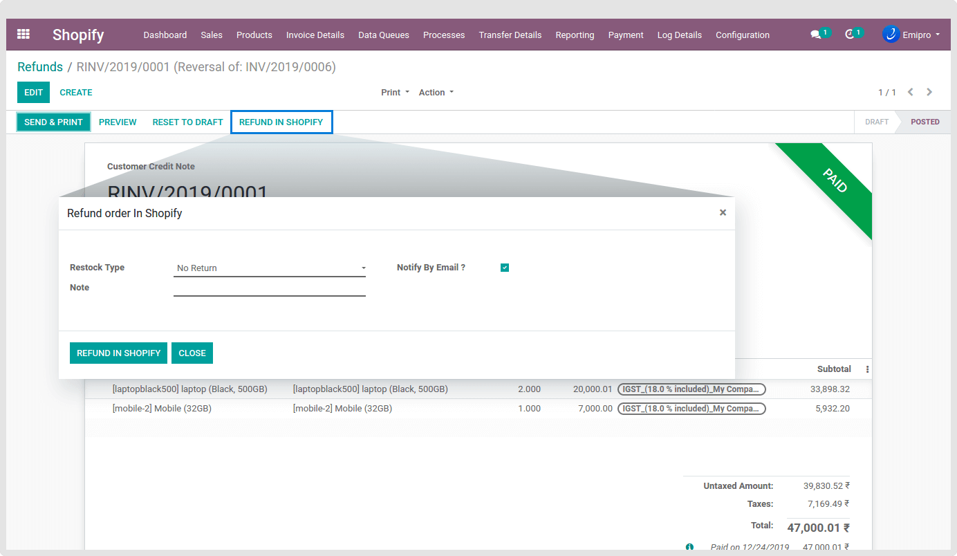 Before we create a Refund in Shopify, it is necessary to Create an Invoice of the Sales Order against which we need to raise the Refund. Process that invoice further and make it posted. After this process, click Add Credit Note. This will reverse the transaction of invoice value that you posted. At this level, you can enter the reason for adding a credit note and select the specific journal if required. However, these are optional. Confirm the Credit Note and Register the Payment.