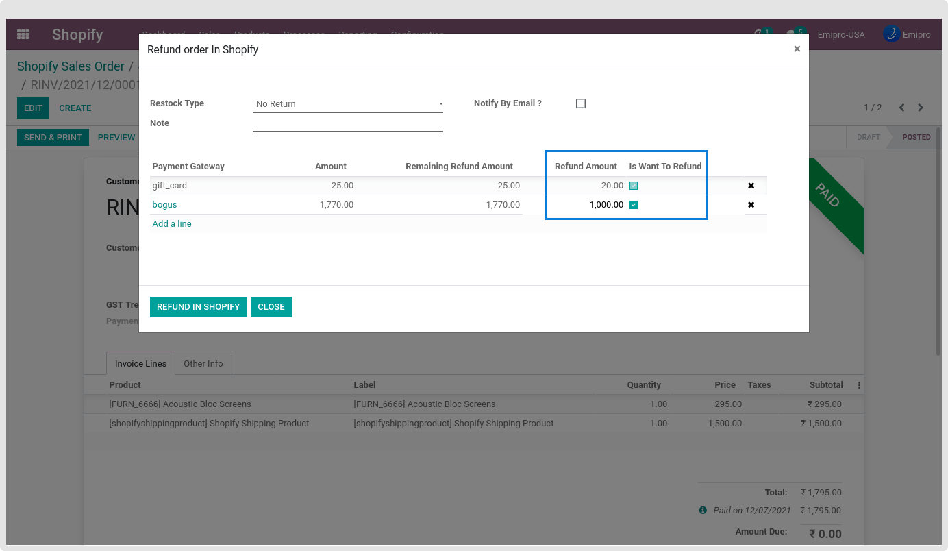 As soon as this process is complete, you will see the button Refund in Shopify. Process it further and you will find a button Refund in Shopify. Click on it and a window will open. Choose the Restock Type, enter the Note and decide whether you want to Notify by Email ? to your customer or not.