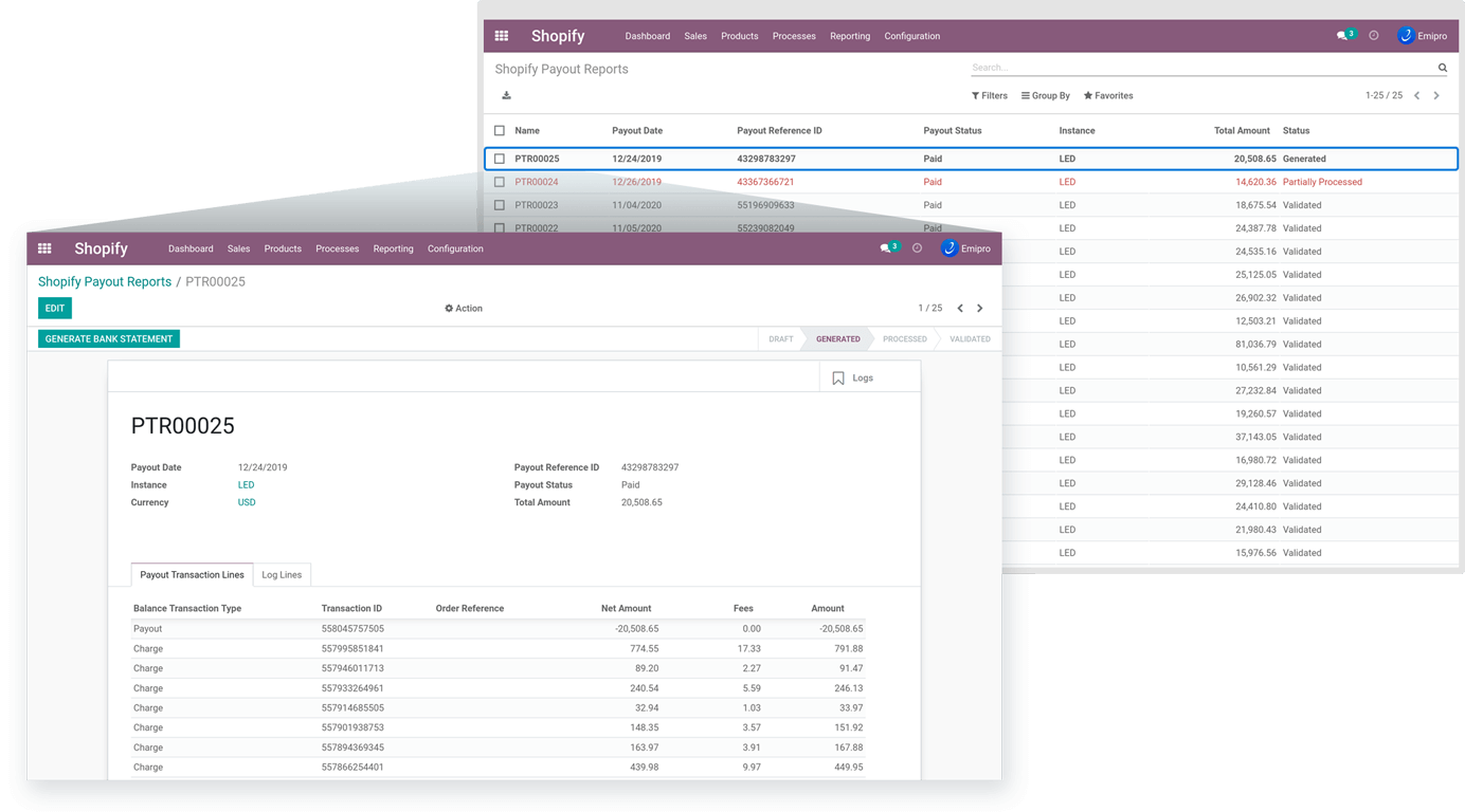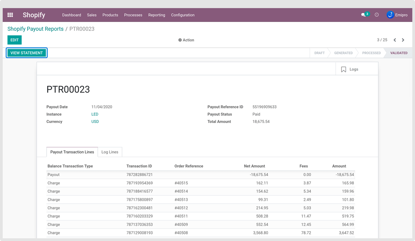 Click on any of the reports that you imported and you will see all the transactions of Shopify along with its types. Now, click on the Generate Bank Statement button to further process and validate the report. This will keep track of the financial movements that occur on your bank accounts and later on, reconcile them with the transactions recorded in your accounting.