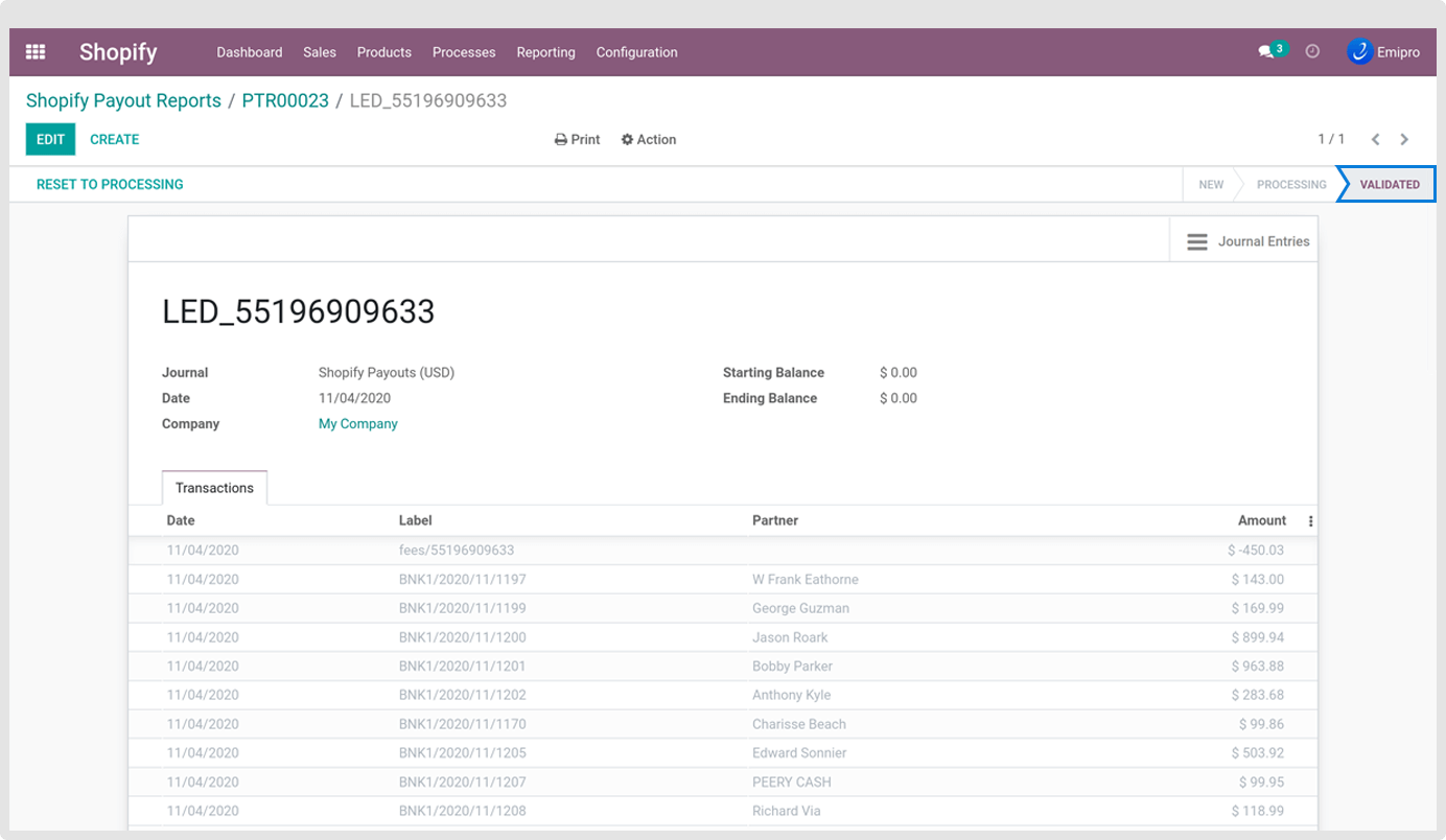 Now, when you import Shopify Payout Reports from Shopify via Shopify / Process / Operations, you will find it at Shopify / Sales / Invoice & Payout / Payout Report.