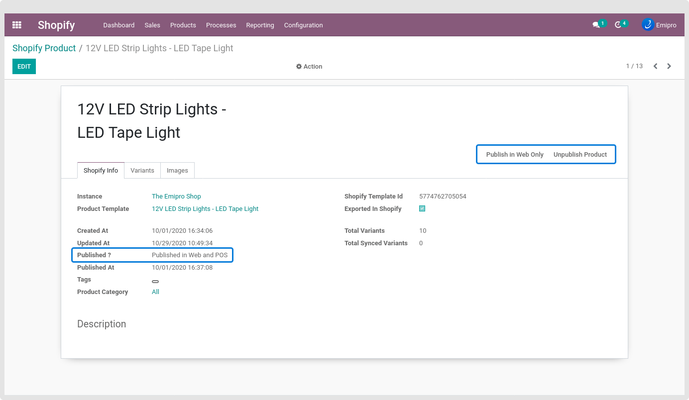After Syncing/Importing new products from Shopify (Refer section 4), navigate to Shopify / Products. Here you will see all the products that are successfully imported from Shopify. Click on any one of the products and you will see a dedicated window in which there will be certain useful details to have eyes on like Publish status for Shopify, Export status for Shopify, Variants details, Create Date, Update Date & Publish Date, etc.