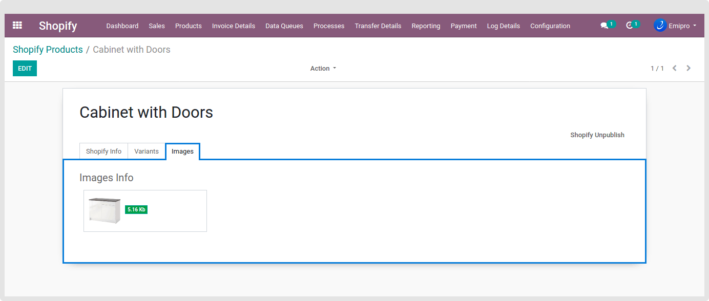 Now, navigating to the Images section, you will see all the product’s images synced from Shopify. However, you can only remove the product image from this section. If you want to Add or Update the image for a specific product, you need to make it from Sales / Products which is Odoo default product operation. For example, if you want to add a new image at Shopify, upload an image to the product and you can then carry out the Update Product process which we will see in the next section. In this way, you can update the product images at Shopify from Odoo.