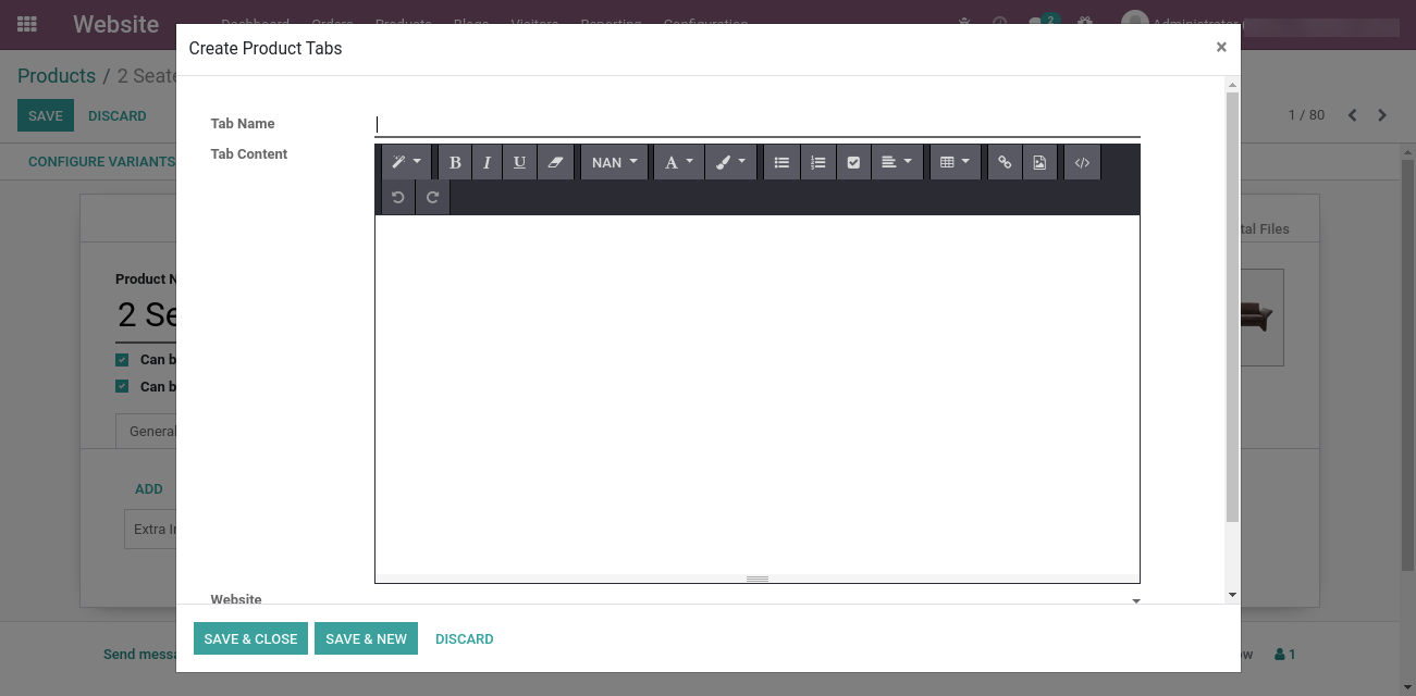 - Step 2: Simply go to the Product tab option, you will find the Add link. By clicking on the Add link Create Product Tabs popup will appear. Specify the Tab name, Content (you can directly add Html content over there) and you can set this option for web-site as well.