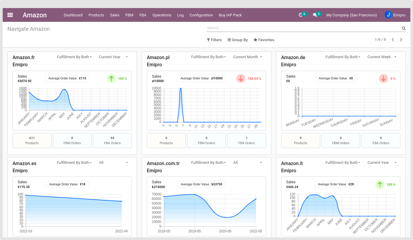 - Connector’s dashboard will be helpful for users to analyze different marketplaces. Emipro’s Amazon connector dashboard will be the user’s single page to monitor all the Amazon marketplace’s orders as well as products. Based on graphical analyses of orders the user can get an idea about current sales volume.