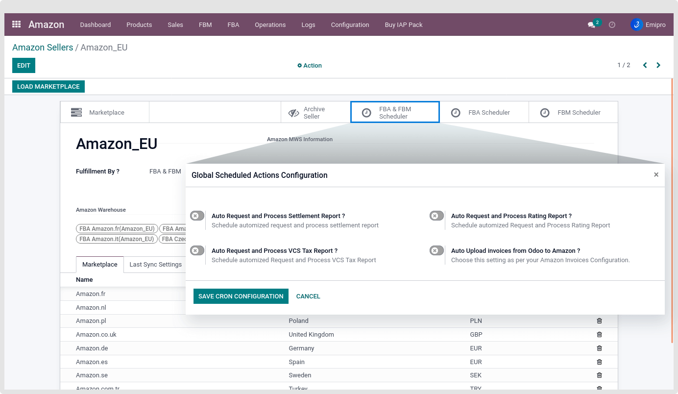 The user can set a scheduler in the system to download and process settlement reports automatically. The user can set the scheduler by navigating to Amazon ↣ Configuration ↣ Sellers ↣ FBA & FBM Schedulers.