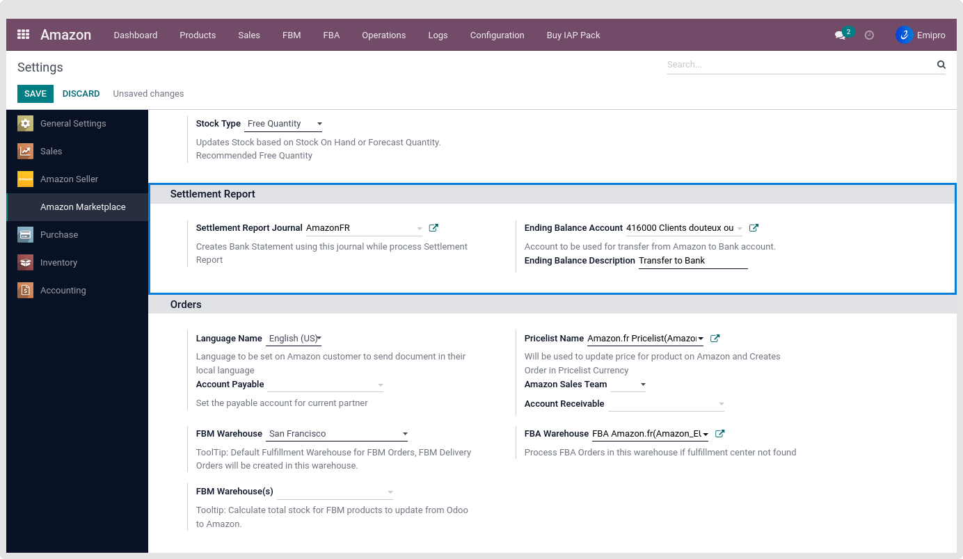 To set fields Go to Amazon ↣ Configuration ↣ Settings ↣ Amazon Marketplace ↣ Select Seller ↣ then Select Marketplace ↣ Settlement Report.