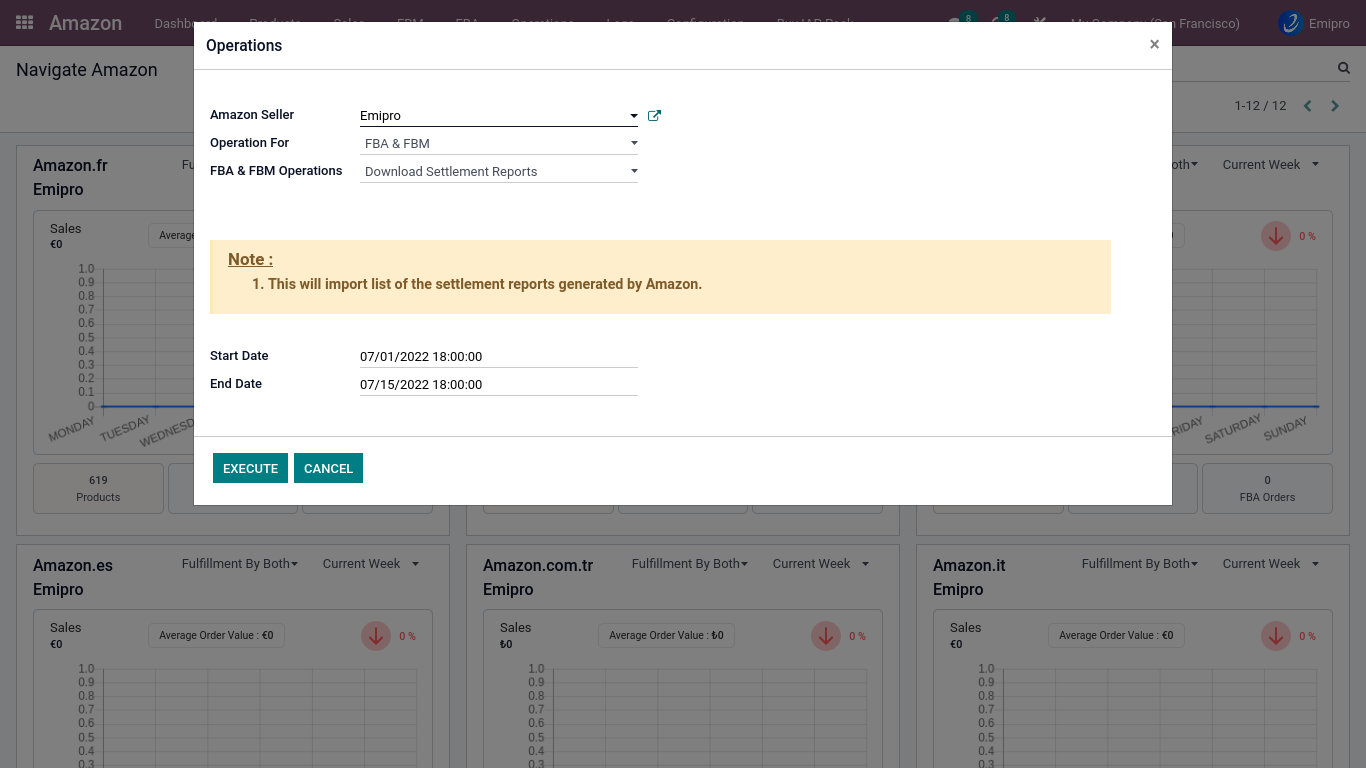 - Settlement reports are generated regularly by Amazon at the seller central account, and the seller can download them from Odoo.