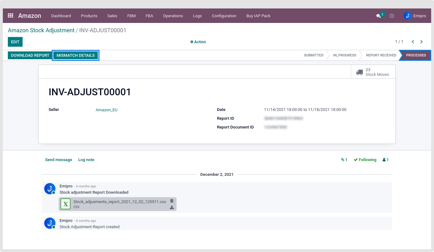 Now, the user needs to process the fetched reports from Amazon. Click on any of the listed reports. The user will see the button to process the Inventory Adjustments as shown below. The user can also see the real-time status of adjustments in the Amazon FBA Inventory.