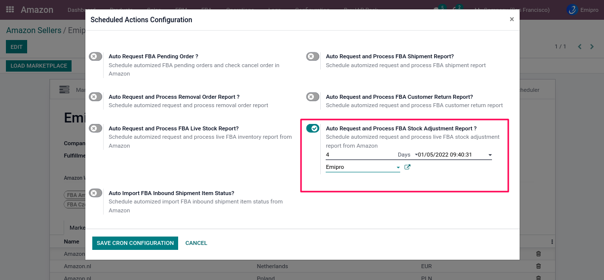 - Go to Amazon ↣ Configuration ↣ Sellers ↣ FBA Scheduler.
