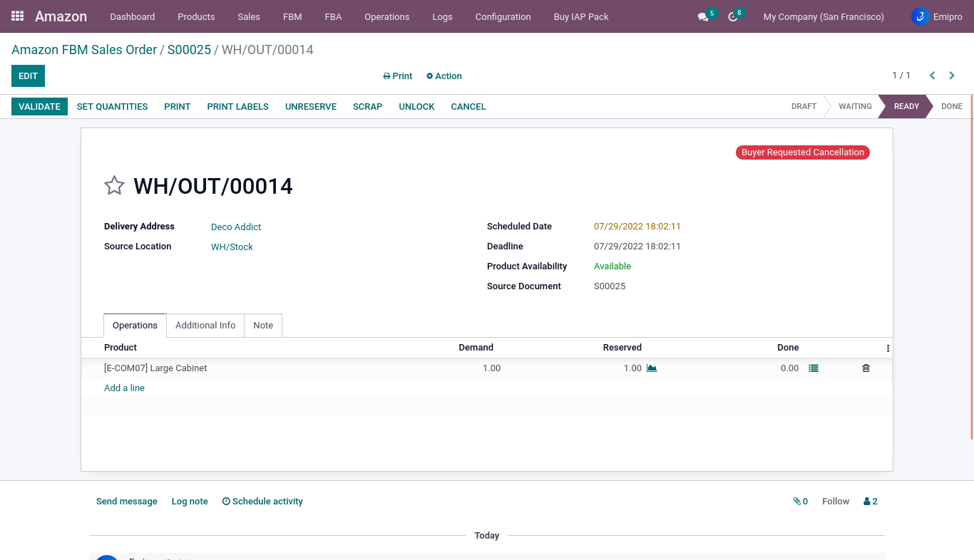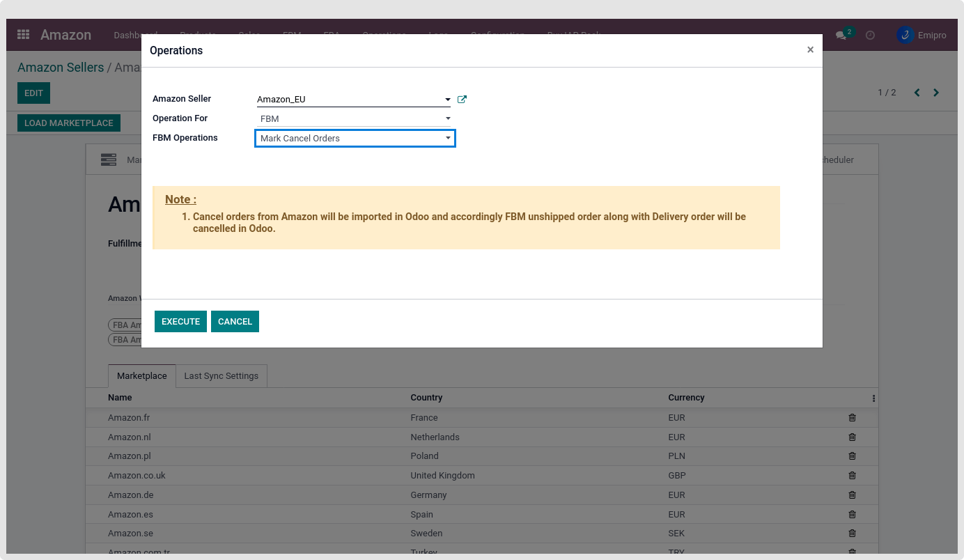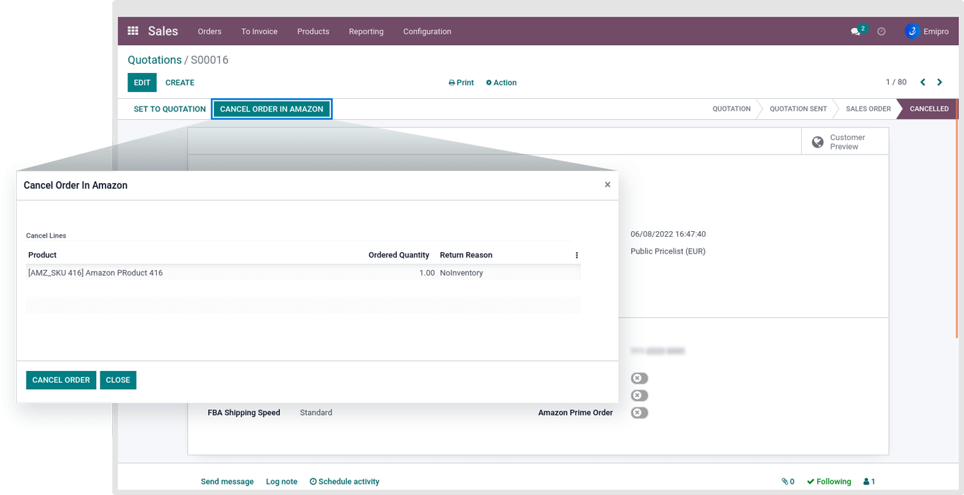 - The user can cancel any Amazon orders directly from Odoo and can also import FBM-canceled orders from Amazon to Odoo.