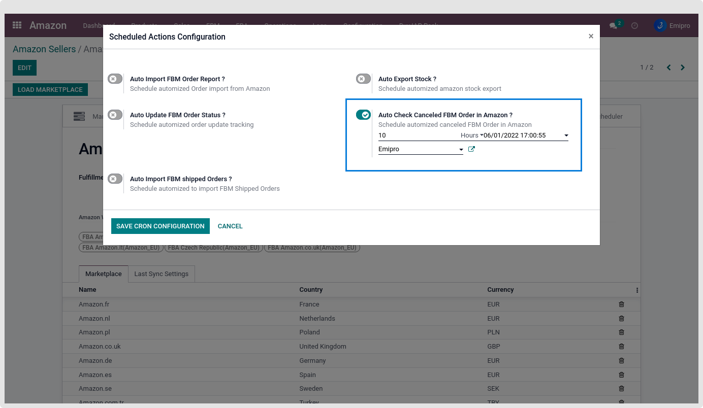 - When an order is canceled in Amazon, the system will cancel the order in Odoo as well. The system can fetch FBM cancel orders from Amazon to Odoo in 2 ways: