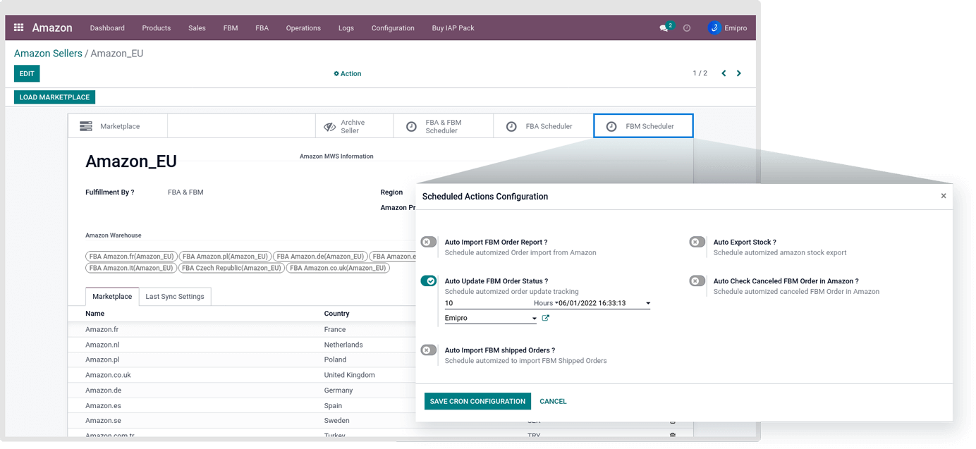 - The user can configure this automated job from Amazon configuration. This scheduler will set a specific interval for updating order status and tracking number from your sales orders from Odoo to Amazon. The user can set different schedulers for different sellers.