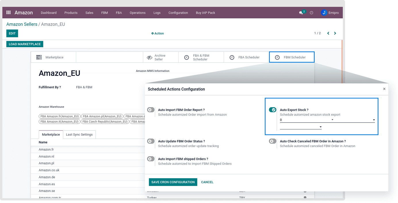 Configure scheduler to export stock from Odoo to Amazon. This cron job will update stock for that selected seller.
