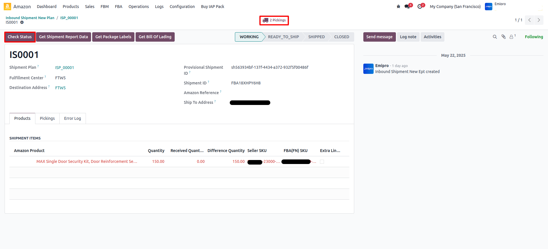 When the product is transferred from Merchant warehouse to transit then the user must transfer first picking from merchant warehouse to transit location i.e user must validate the Out Picking Type. After that user can check the status on Amazon. On click of this button, the system will check the status in Amazon and transfer stock from Transit to FBA location.