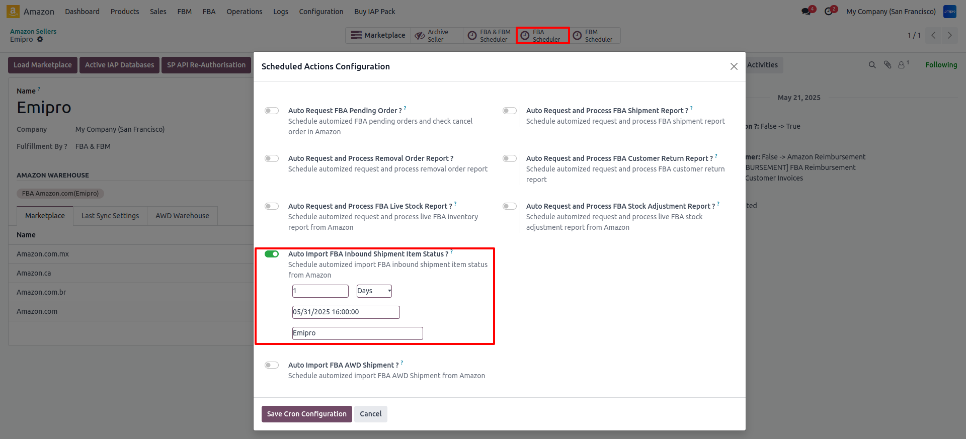 You can configure the scheduler by navigating to Amazon / Configuration / Seller. You will need to navigate to Inbound Shipment section. Once it is activated the system will automatically execute the scheduler. check for all inbound shipments which are not closed and also for those shipments which are not finally closed by Amazon.
