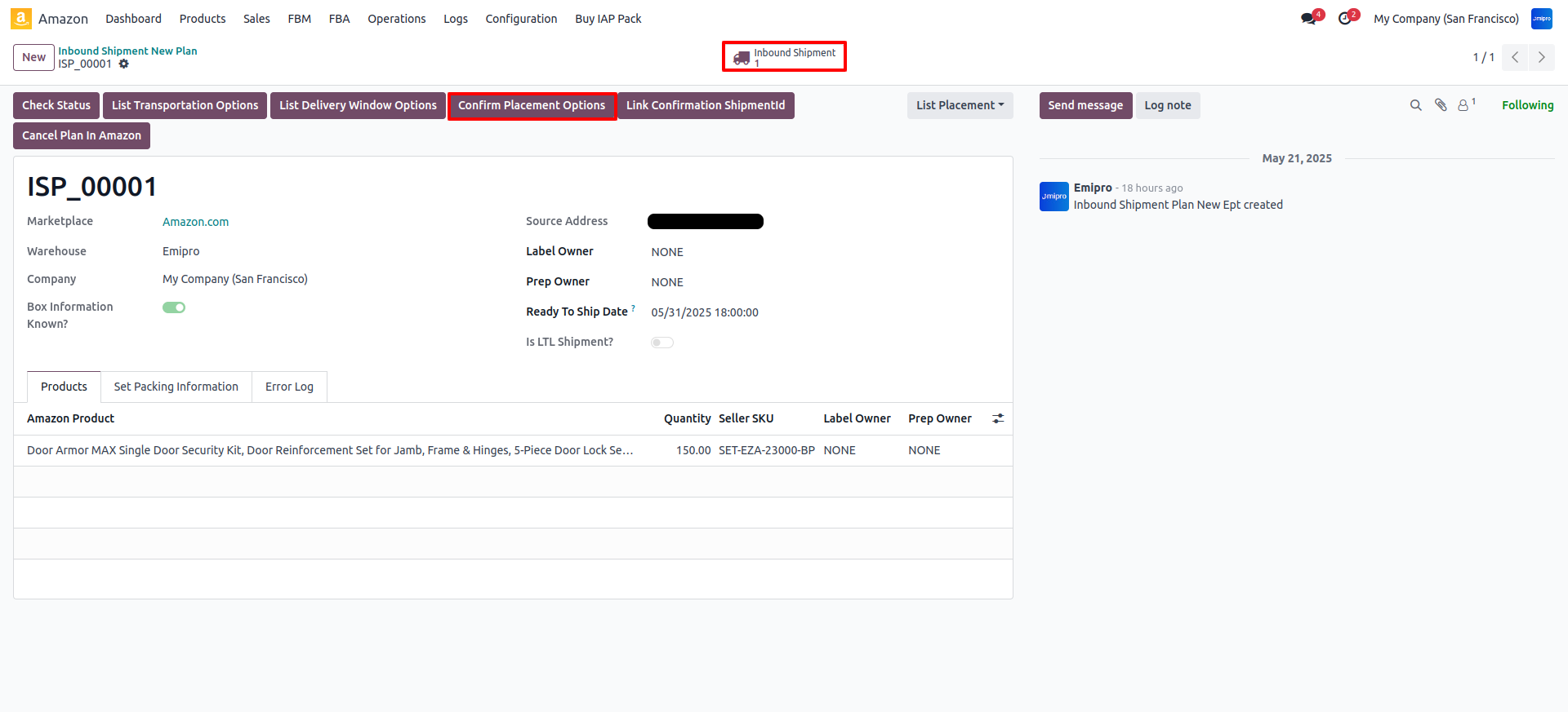 Once you complete the step 7 you get a new button Confirm Placement Option Click on the confirm placement button, then the system will confirm the shipment in the seller central and create two pickings in the odoo (IN and OUT) in the respective shipments for corresponding products.