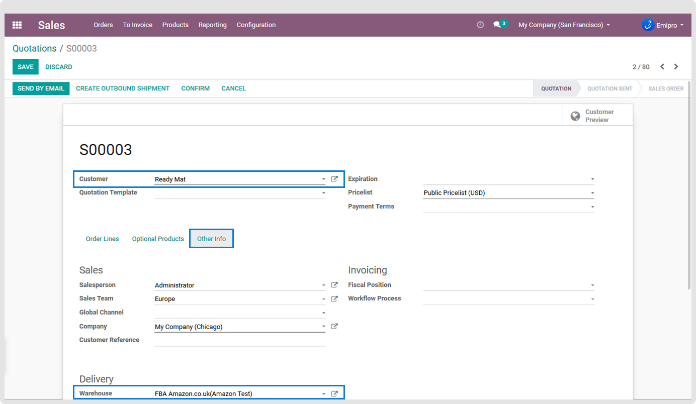 - The user needs to choose the Sales Quotation for which the user wants to create an outbound order and then from the Other Info tab the user can set FBA warehouse from where the user wants this order to be shipped.